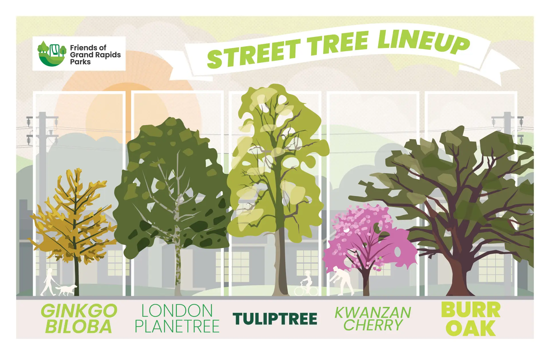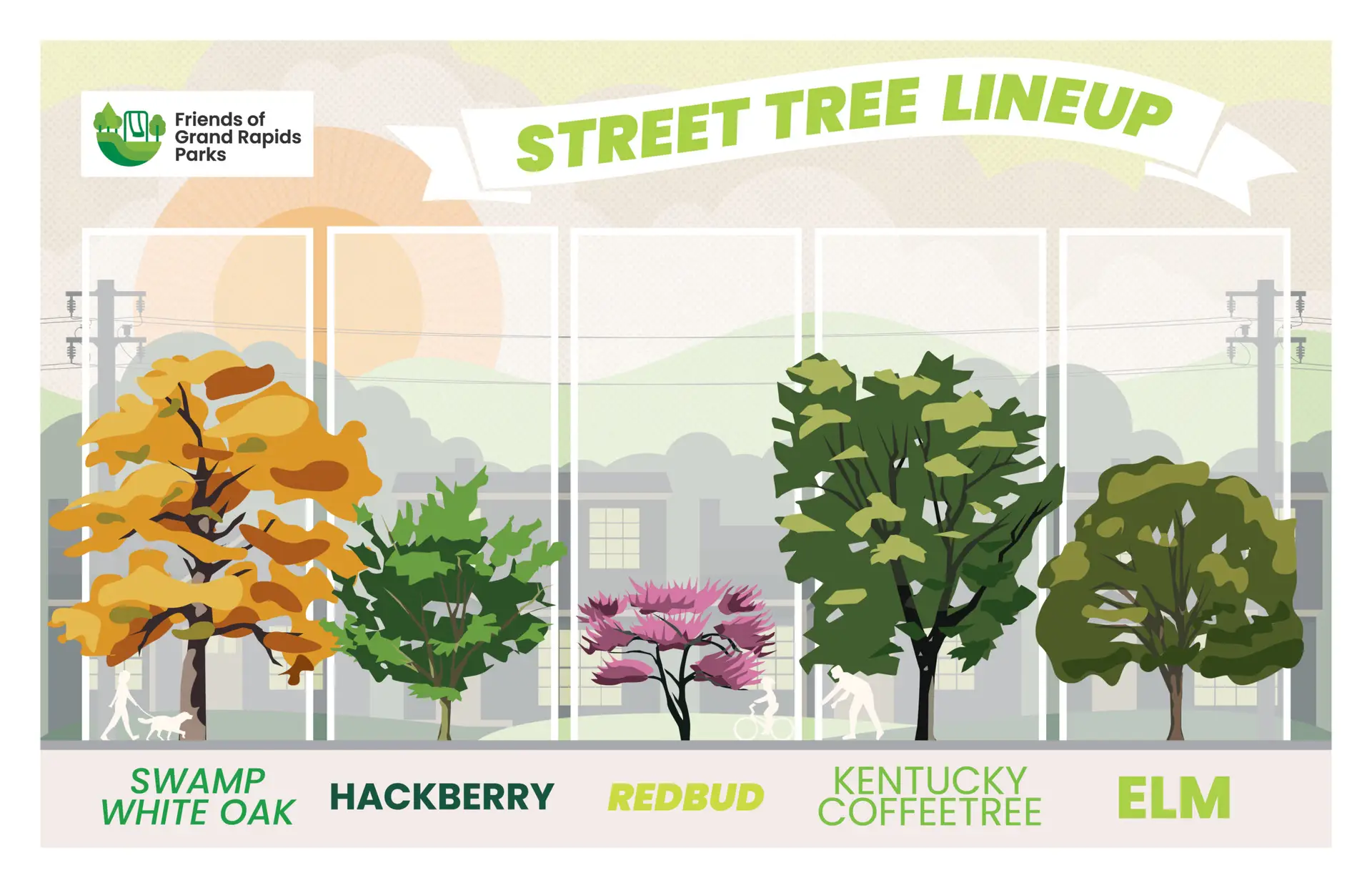 Each year, Friends of Grand Rapids Parks plants over 60 unique species of trees as part of our tree planting vision. Our Street Tree Lineup shown in the images below includes 20 of our favorite trees to plant in Grand Rapids! When planted in the right spots, these species have all proven to provide great tree benefits for residents and wildlife, making them all great choices for our urban tree canopy.
