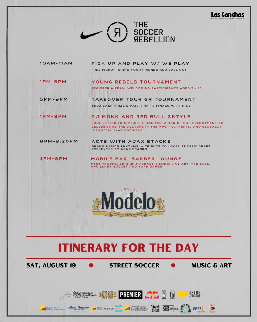 “We are thrilled to unveil The Grand Rapids Takeover Tournament as a testament to the players who are the lifeblood of American soccer,” said Michael Dublis, Founder and Chief of The Soccer Rebellion. “Through this dynamic celebration of both skill and lifestyle, we’re igniting a movement that empowers players to shape the future of the game. The Takeover Tour is the vehicle that propels this revolution forward, and we’re excited to collaborate with partners like Modelos and Friends of the Park to make this vision a reality.”